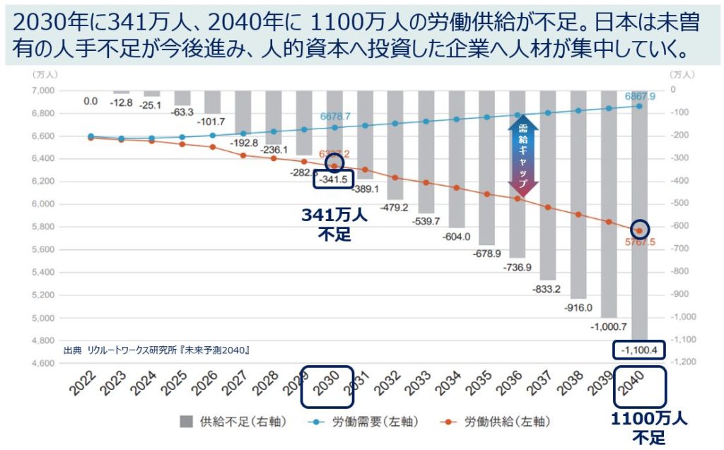 日本は人手不足の時代に突入しています。リクルートワークス研究所の『未来予測2040』によると、2030年には341万人、2040年には1100万人の労働者が足りなくなると予測されています1。人材が不足する中で、人的資本に投資する企業が優位になります。これから社会に出る皆さんは、そんな時代の中で活躍することになります。ある意味、超、売り手市場です。